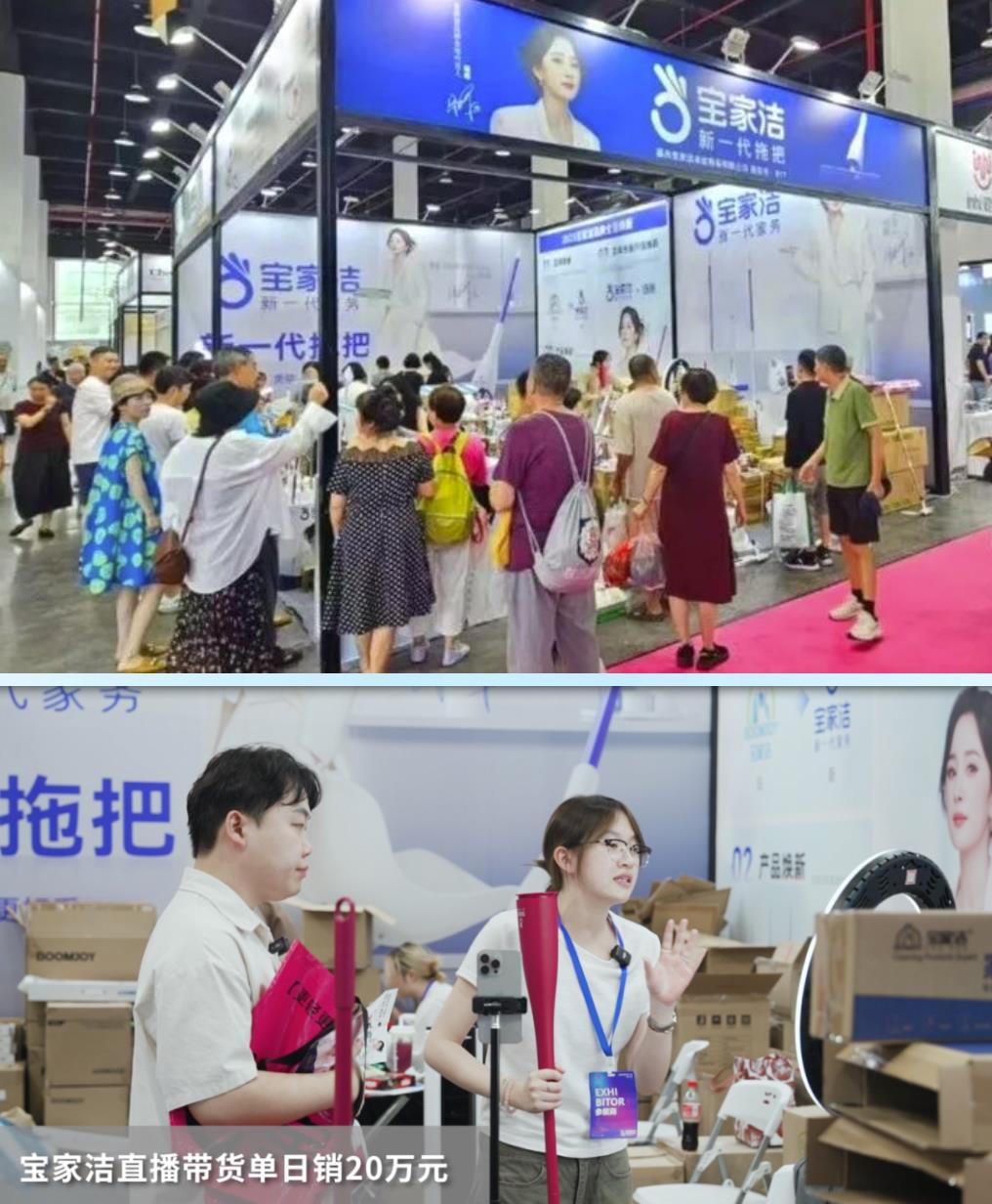本届嘉交会还集聚了一批专精特新企业,国内造纸行业领军企业、嘉兴本土制造代表景兴纸业便是其中之一。展位负责人宋群利表示,希望依托嘉交会平台推广自有品牌“品萱”,让更多嘉兴市民了解身边的外贸优品。据悉,景兴纸业展出的纸品韧性强、遇水不易破,尤其婴幼儿专用乳霜纸以亲肤柔和的特性圈粉,三天累计售出1000余单。 03线上线下联动,讲好嘉兴优品故事 宝家洁创新营销玩法,将线上运营团队派驻展会现场,同步开启实时直播带货,以“线下展示+线上互动”的模式打通流量转化链路。本次展会带来的杨幂联名款拖把,凭借高颜值外观与“棉头永不发硬”的实用优势,成为嘉交会“网红爆款”,单日线上线下销售额累计超20万元,较传统展会营销模式大幅提升转化效率。