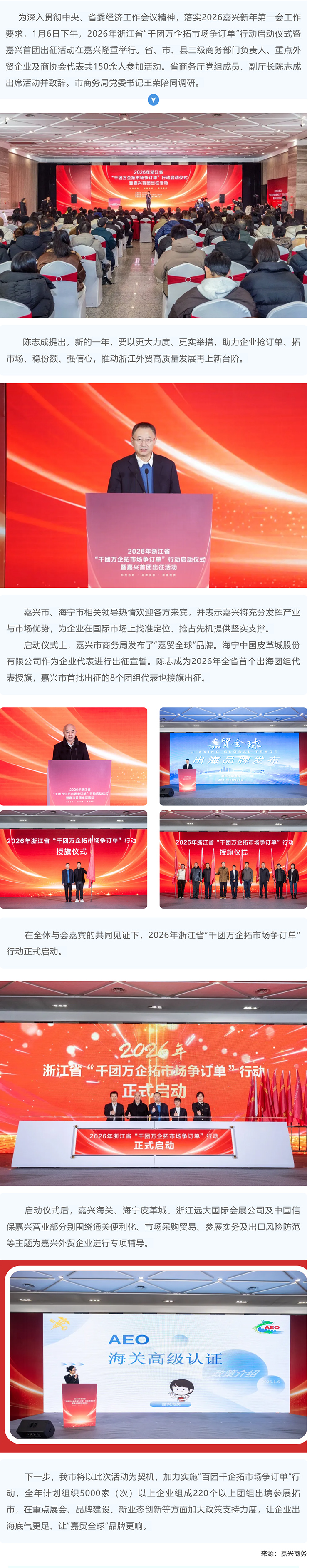 2026年浙江省“千团万企拓市场争订单”行动启动仪式在嘉兴举办,新年首团吹响出征号角
